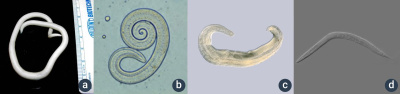 - svalovec stočený (b) – Jeho larvy se opouzdřují ve svalovině, např. v praseti divokém.