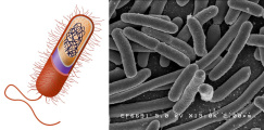 Bakterie jsou obvykle jednobuněčné organismy. Jejich buňky jsou drobné (velké v řádu mikrometrů), mají jednodušší stavbu než buňky živočichů, rostlin či hub. DNA (a) v buňkách bakterií je uložena volně v cytosolu. Buňku ohraničuje cytoplazmatická membrána (b), buněčná stěna (c) a případně slizové pouzdro (d). Bakterie se mohou pohybovat např. za pomoci bičíků (e) a přichycovat na povrchy pomocí brv (f). Bakterie mohou být různého tvaru, např. kulaté (koky) či tyčinkovité.