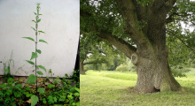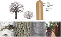 Podle podoby stonku se rostliny dělí na byliny (a, stonek nedřevnatí) a dřeviny (b–‍c, stonek dřevnatí, vytváří se u něj druhotná kůra a případně borka). Mezi dřeviny náleží keře (b) a stromy (c).