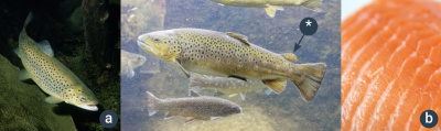 • pstruh obecný potoční (g) – Jako další lososovití má tukovou ploutvičku, mívá červené skvrny na světlém podkladu. Žije v rychle proudící vodě s větším obsahem kyslíku (např. v horních a středních tocích řek, pod přehradami).