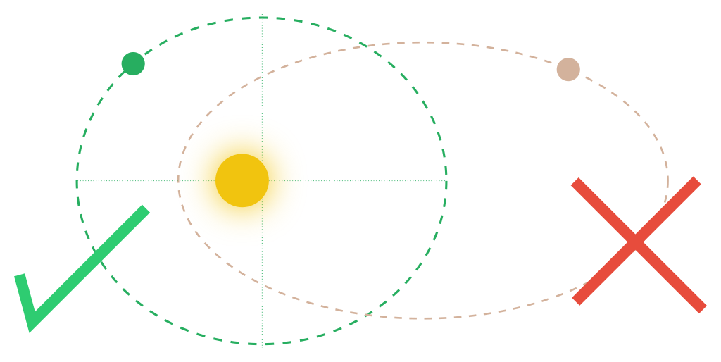 Planety se kolem Slunce pohybují po málo výstředných elipsách (tj. skoro kružnicích). Slunce se přitom nachází v jednom z ohnisek takové elipsy.