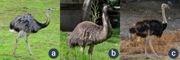Běžci nedokážou létat, rychle však běhají. Patří mezi ně např. pštros dvouprstý (a) žijící v Africe, nandu pampový (b) z Jižní Ameriky či australský emu hnědý (c).