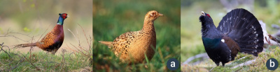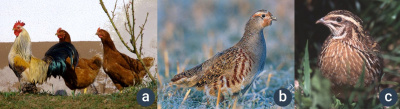 Hrabaví ptáci nepříliš dobře létají, množství času tráví na zemi. Do této skupiny náleží např. křepelka polní (d) či koroptev polní (e). Tyto druhy jsou ohrožené hlavně intenzivním zemědělstvím. Tetřev hlušec (f) je v Česku vzácný. Kur domácí (g, samice je slepice, samec kohout) byl pravděpodobně vyšlechtěn mj. z kura bankivského žijícího v jižní a jihovýchodní Asii. Bažant obecný (h) pochází z Malé Asie, projevuje se u něj výrazná pohlavní dvojtvárnost.