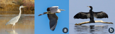 Volavka popelavá (p) se živí hlavně rybami, v letu rozlišit od čápa podle prohnutého krku. Kormorán velký (q) je v dospělosti černě zbarven, v jeho potravě též převládají ryby.