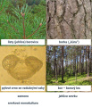 - borovice lesní (a, sosna) – Má jehlice po dvou, borka vespod kmene je šedohnědá a rozpukaná, výše se odlupuje v rezavých šupinkách.