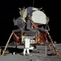 Měsíc prozatím zůstává jediným vesmírným tělesem (mimo Zemi), které bylo navštíveno člověkem. Jako první se na měsíčním povrchu prošel astronaut Neil Armstrong (stalo se tak 20. července 1969), jenž byl součástí programu Apollo 11 společně s Edwinem „Buzzem“ Aldrinem (e) a pilotem Michaelem Collinsem. Astronauti Armstrong a Aldrin se na Měsíc dopravili v lunárním modulu (d). Pilot Collins zůstal ve velitelském modulu na oběžné dráze Měsíce. V programu Apollo se k pohybu po Měsíci používaly terénní průzkumná vozidla – lunární rovery (f).